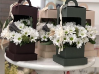 Стойкая декоративная композиция с кустовой ромашковой хризантемой, венчиками лаванды и зеленью в фирменной коробке-фонарике с ручками.